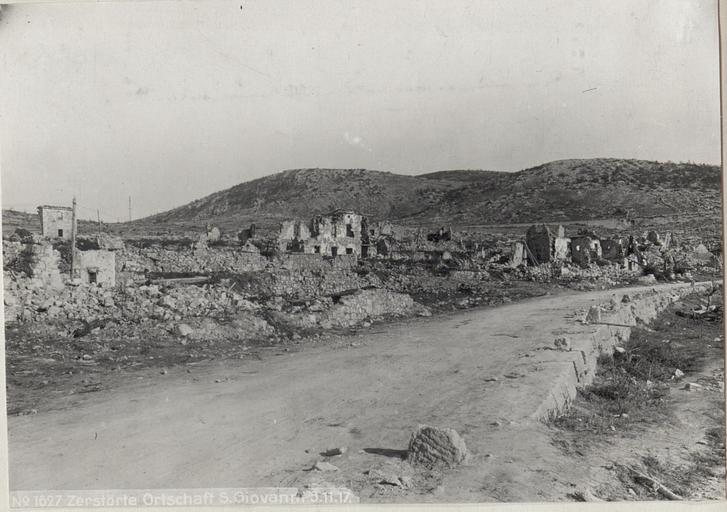 Keywords: Zerstörte Ortschaft S.Giovanni 3.11.17. (BildID 15607816).jpg depicted place austria de K u k Kriegspressequartier Lichtbildstelle - Wien credit line Österreichische Nationalbibliothek - Austrian National Library http //www bildarchivaustria at/Preview/15607816 jpg<br>Catalog http //www bildarchivaustria at/Pages/ImageDetail aspx p_iBildID 15607816 accession number WK1/ALB075/21699 http //creativecommons org/publicdomain/mark/1 0/ el Α΄ Παγκόσμιος Πόλεμος en World War I zh 第 次世界大战 ca Primera Guerra Mundial it Prima guerra mondiale cs První světová válka cy Y Rhyfel Byd Cyntaf hy Առաջին համաշխա հային պատե ազմ ga An Chéad Chogadh Domhanda eu Lehen Mundu Gerra et Esimene maailmasõda gl Primeira Guerra Mundial es Primera Guerra Mundial ru Пе вая ми овая война az Birinci dünya müharibəsi pt Primeira Guerra Mundial no Første verdenskrig tr I Dünya Savaşı lv Pirmais pasaules karš lt Pirmasis pasaulinis karas ro Primul Război Mondial ar الحرب العالمية الأولى is Fyrri heimsstyrjöldin pl I wojna światowa yi ערשטע ווע ט מ חמה be Пе шая сусветная вайна fr Première Guerre mondiale bg Пъ ва световна война hr Prvi svjetski rat de Erster Weltkrieg hu Első világháború hi प्रथम विश्वयुद्ध bs Prvi svjetski rat fi Ensimmäinen maailmansota da 1 verdenskrig ja 第 次世界大戦 he מ חמת העו הראשונה ka პირველი მს ფლი მი sr П ви светски ат sq Lufta e Parë Botërore ko 1차 세계 전 sv Första världskriget mk П ва светска војна sk Prvá svetová vojna gd An Cogadh Mòr uk Пе ша світова війна sl Prva svetovna vojna PD-old-80-1923 Kriegspressequartier Alben 1914 - 1918 Images uploaded by Fæ Photographs taken on 1917-11-03