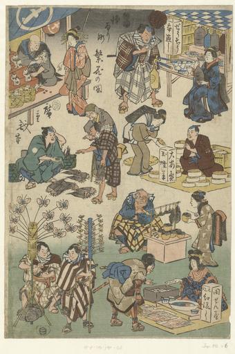 | Keywords: Zeven kraampjes op de avondmarkt in de Joruri straat-Rijksmuseum RP-P-OB-JAP-26.jpeg accession number RP-P-OB-JAP-26 Utagawa; Hiroshige I Utagawa died 1858; Ibaya Sensaburo Hiroshige I credit line nl Verschillende marktkraampjes tijdens een avondmarkt waaronder een maneki neko wenkend kattenbeeld verkoper een sake kraampje een gerstkoopman een verkoper van bamboewortels en mannen met speelgoed vlinders Label Line mentioned on object Hiroshige I Utagawa 1797 - 1858 1852 kleurenhoutsnede; lijnblok in zwart met kleurblokken Collection prenten; Japan collectie blad Height mm 370 blad Width mm 253 exhibition history paper object history object type PD-US PD-old Data and photography rights All data and all images made available through the API are either in the public domain or are subject to a CC0 license https //www rijksmuseum nl/en/api/terms-and-conditions-of-use cc-zero place of creation Japan http //www rijksmuseum nl/collectie/RP-P-OB-JAP-26 http //hdl handle net/10934/RM0001 COLLECT 46037 handle Zeven kraampjes op de avondmarkt in de Joruri straat Uploaded with GWToolset Rijksmuseum RP-P-OB-JAP-26 http //www rijksmuseum nl/media/assets/RP-P-OB-JAP-26 Images uploaded by Fæ Japanese 19th-century prints in the Rijksmuseum Amsterdam Images from the Rijksmuseum |