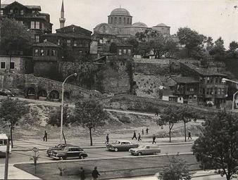 Keywords: zeyrek unkapanı atatürk bulvarı atatürkbulvarı zeyrek camii zeyrekcamii molla zeyrek camii mollazeyrekcamii pantokrator camii pantokratorcamii pantokrator manastırı kilisesi pantokratormanastırıkilisesi ataturk boulevard ataturkboulevard zeyrek mosque zeyrekmosque pantokrator monastery pantokratormonastery eski i̇stanbul eskiistanbul old istanbul oldistanbul fatih i̇stanbul istanbul salt araştırma saltaraştırma salt research saltresearch salt online saltonline eski araba eskiaraba eski arabalar eskiarabalar old cars oldcars outdoor city architecture road The area of Zeyrek is located in Fatih on the fourth hill of İstanbul that leads from Atatürk Boulevard and Haliç. The Pantocrator Monastery at the center of this site is one of many major religious buildings in the neighbourhood that date back to the Byzantine period. In 1453 Muhammed the Conqueror converted the Pantocrator Church into the Molla Zeyrek Mosque. When it was renovated in the 18th century, baroque details were added to the mosque according to the architectural tendencies of the period. The last renovation was made in 1966, by the Pious Foundations. The mosque and the wooden 19th century houses that surround it are marked as a World Heritage Area under the protection of UNESCO. Today, Zeyrek is home to major monumental buildings from the Byzantine, Ottoman, as well as the Republican periods, including the Zeyrek Social Insurance Institution, designed by Sedad Hakkı Eldem, and the İstanbul Drapery Bazaar (İMÇ), designed by Doğan Tekeli, Sami Sisa and Metin Hepgüler. SALT Research Rahmi M. Koç, Sedad Hakkı Eldem Archive Fatih ilçesine bağlı olan Zeyrek semti, İstanbul’un dördüncü tepesi ve eteklerinde yer alır. Semt, Atatürk Bulvarı ve Haliç’ten başlayıp yükselen yamaçta, Bizans döneminden itibaren yapılmış çeşitli teraslamalar ve setlerin üstüne kuruludur. Bizans, Osmanlı ve Cumhuriyet dönemi yapılarına ev sahipliği yapmıştır. Adını, Fatih Sultan Mehmet’in Pantokrator Manastırı Kilisesi’nden dönüştürdüğü Molla Zeyrek Camii’nin baş müderrisi Zeyrek Mehmet Efendi’den alır. Bizans döneminden kalma önemli dinî yapılar arasında bulunan kilise, üç ayrı şapelin bir araya gelmesinden oluşur. İstanbul’un fethiyle birlikte şehirdeki ilk medresenin kurulduğu yapı, medreselerin Fatih Külliyesi’ne taşınmasıyla camiye çevrilir. 18. yüzyılda büyük bir onarım geçiren camiye, dönemin mimari anlayışına uygun olarak barok detaylar eklenir; son onarımı ise, Vakıflar İdaresi tarafından 1966’da gerçekleştirilir. Cami ile 19. yüzyıla ait ahşap konut dokusunu hâlâ koruyan çevresi, bugün UNESCO’nun koruması altında “Dünya Miras Alanı” kabul edilmektedir. Bölgede Sedad Hakkı Eldem’in tasarladığı Zeyrek Sosyal Sigortalar Kurumu binası ile Doğan Tekeli-Sami Sisa-Metin Hepgüler ortaklığında tasarlanan İstanbul Manifaturacılar Çarşısı (İMÇ), Cumhuriyet döneminin önemli miraslarındandır. SALT Araştırma Rahmi M. Koç, Sedad Hakkı Eldem Arşivi The area of Zeyrek is located in Fatih on the fourth hill of İstanbul that leads from Atatürk Boulevard and Haliç. The Pantocrator Monastery at the center of this site is one of many major religious buildings in the neighbourhood that date back to the Byzantine period. In 1453 Muhammed the Conqueror converted the Pantocrator Church into the Molla Zeyrek Mosque. When it was renovated in the 18th century, baroque details were added to the mosque according to the architectural tendencies of the period. The last renovation was made in 1966, by the Pious Foundations. The mosque and the wooden 19th century houses that surround it are marked as a World Heritage Area under the protection of UNESCO. Today, Zeyrek is home to major monumental buildings from the Byzantine, Ottoman, as well as the Republican periods, including the Zeyrek Social Insurance Institution, designed by Sedad Hakkı Eldem, and the İstanbul Drapery Bazaar (İMÇ), designed by Doğan Tekeli, Sami Sisa and Metin Hepgüler. SALT Research Rahmi M. Koç, Sedad Hakkı Eldem Archive Fatih ilçesine bağlı olan Zeyrek semti, İstanbul’un dördüncü tepesi ve eteklerinde yer alır. Semt, Atatürk Bulvarı ve Haliç’ten başlayıp yükselen yamaçta, Bizans döneminden itibaren yapılmış çeşitli teraslamalar ve setlerin üstüne kuruludur. Bizans, Osmanlı ve Cumhuriyet dönemi yapılarına ev sahipliği yapmıştır. Adını, Fatih Sultan Mehmet’in Pantokrator Manastırı Kilisesi’nden dönüştürdüğü Molla Zeyrek Camii’nin baş müderrisi Zeyrek Mehmet Efendi’den alır. Bizans döneminden kalma önemli dinî yapılar arasında bulunan kilise, üç ayrı şapelin bir araya gelmesinden oluşur. İstanbul’un fethiyle birlikte şehirdeki ilk medresenin kurulduğu yapı, medreselerin Fatih Külliyesi’ne taşınmasıyla camiye çevrilir. 18. yüzyılda büyük bir onarım geçiren camiye, dönemin mimari anlayışına uygun olarak barok detaylar eklenir; son onarımı ise, Vakıflar İdaresi tarafından 1966’da gerçekleştirilir. Cami ile 19. yüzyıla ait ahşap konut dokusunu hâlâ koruyan çevresi, bugün UNESCO’nun koruması altında “Dünya Miras Alanı” kabul edilmektedir. Bölgede Sedad Hakkı Eldem’in tasarladığı Zeyrek Sosyal Sigortalar Kurumu binası ile Doğan Tekeli-Sami Sisa-Metin Hepgüler ortaklığında tasarlanan İstanbul Manifaturacılar Çarşısı (İMÇ), Cumhuriyet döneminin önemli miraslarındandır. SALT Araştırma Rahmi M. Koç, Sedad Hakkı Eldem Arşivi |
