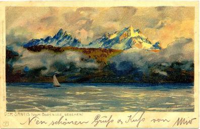 | Keywords: Ziemer Bodensee und Säntis.jpg  Michael Zeno Diemer Der Säntis vom Bodensee aus gesehen postcard sent in 1903 scan from http //www ebay de/ < 1903 creator Michael Zeno Diemer PD-old Michael Zeno Diemer Lake Constance in art Remote views of Säntis |