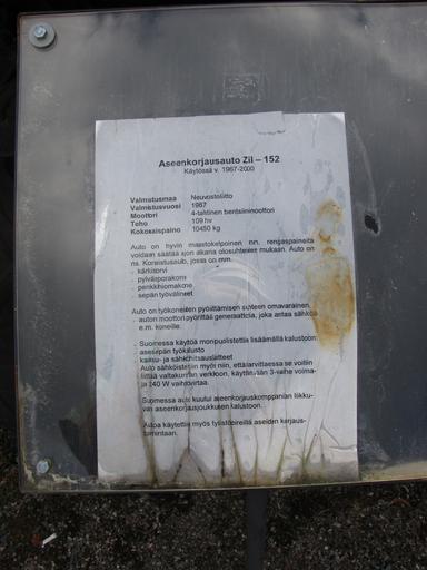 | Keywords: Zil-152 mobile workshop 2.JPG en Zil-152 military truck fitted as a mobile workshop Equipped with center lathe pedestal drill bench grinder and smith's tools Later added with gas and electric welding tools and weapons smith's equipment Electricity provided by a generator connected to the truck engine or from grid Used by Finnish army in mobile ordnance repair platoons Photographed in Hämeenlinna artillery museum fi Aseenkorjausautoksi varusteltu Zil-152 sotilaskuorma-auto Varustuksena mm kärkisorvi pylväsporakone penkkihiomakone ja sepäntyövälineet Myöhemmin lisätty kaasu- ja sähköhitsauslaitteet ja asesepän työkalusto Auton moottorin pyörittämä generaattori antaa sähkövirran laitteille voidaan myös liittää verkkovirtaan Käytetty suomessa liikkuvan aseenkorjausjoukkueen kalustona Kuvattu Hämeenlinnan tykistömuseossa own MKFI 2010-08-22 61 0 16 23 N 24 27 27 48 E region FI_heading ESE Military vehicles of Finland ZiL military trucks Finnish Artillery Museum gun yard Taken with Canon PowerShot SX10 IS Files by User MKFI |