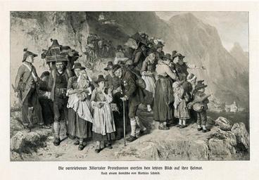 Keywords: Zillertaler Inklinanten - Mathias Schmid.jpg en The protestants from the Tyrolian Zillertal who had to leave their home in 1837 de Die Protestanten aus dem Tiroler Zillertal die ihre Heimat im Jahr 1837 verlassen mussten bar D'efangelischn ZiladÃ¥la de im 1837ga Joa fu dahõam wék miassn hãm <br/> Text Die vertriebenen Zillertaler Protestanten werfen den letzten Blick auf ihre Heimat Nach einem Gemälde von Mathias Schmid http //www 1837-auswanderer de/ century 19 Mathias Schmid tyrolian painter 1835 in See in the Paznaun Valley   1923 in Munich author died more than 70 years ago History of Tyrol state Zillertal Emigrants in art Mathias Schmid PD-old