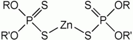 | Keywords: Zinc dialkyl dithio phosphate.png Chemical structure of Zinc dialkyl dithio phosphate Author date of creation selfmade by Shaddack 1 November 2005 Source self-made Copyright Public Domain PD Comments b/w hires PNG; ChemDraw 2005-11-14 own assumed Shaddack zinc compounds |