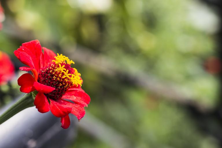 Keywords: zinnia flower red flor petals nature green background bokeh