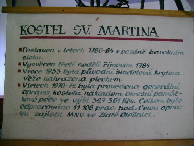 Keywords: Zlatá-OleÅ¡nice-Church-St-Martin-inscription2011.jpg Church of Saint Martin in w Zlatá OleÅ¡nice Jablonec nad Nisou District Zlatá OleÅ¡nice en in Jablonec nad Nisou District in the Liberec Region of the Czech Republic “ inscription Kostel svatého Martina ve w Zlatá OleÅ¡nice Zlaté OleÅ¡nici cs v okrese Jablonec nad Nisou kraj Liberecký “ nápis own Jirka23 2011-07-16 Cc-zero Interior of the Church of Saint Martin Zlatá OleÅ¡nice |