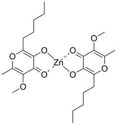 Keywords: Zn(alx)2.svg Chemical structure of bis allixinato zinc II a zinc complex with allixin Own 17 40 16 February 2011 UTC Ed Edgar181 Zinc complexes Pyrones