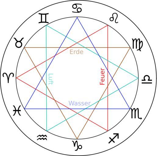 Keywords: ZodiacTrigonsDe.svg en Zodiac with element trigons red fire brown earth cyan air blue water and German lettering Sun moving clockwise Aries on the left own WolfgangRieger 2010-09-30 Zodiac aspects