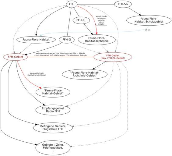 Keywords: Zum Akronym FFH und begrifflichen Ableitungen, sowie einer Auswahl an Deutungen.svg de Zum Akronym FFH und seinen begrifflichen Ableitungen sowie einer Auswahl an Deutungen Diese Grafik dient der Bestimmung eines geeigneten Lemmas für Fauna-Flora-Habitate die durch eine administrative Verwaltungseinheit unter Schutz gestellt wurden Sie zeigt auf anschauliche Weise weshalb fachliche Umgangssprache nicht ohne Bedacht in das Schriftbild der Wikipedia kopiert und Akronyme innerhalb eines Lemmas einer Allgemein-Enzyklopädie gemieden werden sollten es sei denn sie dienen der Begriffsklärung 2014-08-05 22 46 37 own Cmuelle8 cc-zero Source <syntaxhighlight lang dot > digraph FFH node fontname Sans ; edge fontname Sans fontsize 9 ; FFH_exp label Fauna-Flora-Habitat ; FFH-RL_exp label Fauna-Flora-\nHabitat-Richtlinie ; FFH-SG_exp label Fauna-Flora-\nHabitat-Schutzgebiet ; FFH -> FFH_exp n; FFH-RL -> FFH-RL_exp ; FFH-SG -> FFH-SG_exp ; FFH-G_mix color darkred label FFH-Gebiet fontcolor darkred ; FFH-RL-G_mix color darkred label FFH-Gebiet\n bzw FFH-RL-Gebiet fontcolor darkred fontsize 12; FFH-G_exp label \ Fauna-Flora-\nHabitat-Gebiet\ ; FFH-RL-G_exp label \ Fauna-Flora-Habitat-\nRichtlinie-Gebiet\ ; FFH -> FFH-G_mix color gray style dashed ; FFH-G -> FFH-G_mix ; FFH_exp -> FFH-G_mix color gray style dashed ; FFH-G_mix -> FFH-G_exp color red label pleonastisch ein\nHabitat ist ein Gebiet ; FFH -> FFH-RL-G_mix color gray style dashed ; FFH-G -> FFH-RL-G_mix color gray style dashed ; FFH-RL_exp -> FFH-RL-G_mix color gray style dashed ; FFH-RL-G_mix -> FFH-RL-G_exp ; FFH -> FFH-RL dir none ; FFH -> FFH-G dir none ; FFH -> FFH-SG dir none ; FFH -> FFH-RL_exp color red label verkürzende\nUmgangs-\nsprache \nnicht\nintuitiv decorate true ; FFH-G_mix -> FFH-RL-G_mix dir none color red label Mehrdeutigkeit wegen ugs Gleichsetzung FFH u FFH-RL\n+ zus Unklarheit durch Deutungen FFH abseits der Biologie ; FFH-SG_exp s -> FFH_exp ne constraint false color lightblue label ist ein ; // FFH-G_mix -> FFH_exp constraint false color lightblue label ist ein ; // FFH-RL-G_mix -> FFH_exp constraint false color lightblue label ist ein ; node group A ; A1 label Empfangsgebiet\nRadio FFH ; A2 label Beflogene Gebiete\nFlugschule FFH ; A3 label Gebiete i Zshg \nFeldflugplätze \n ; FFH-G_mix -> A1; FFH-G_mix -> A2; FFH-G_mix -> A3; FFH-RL-G_mix -> A1 color gray style dashed ; FFH-RL-G_mix -> A2 color gray style dashed ; FFH-RL-G_mix -> A3 color gray style dashed ; FFH_exp -> FFH-G_exp -> FFH-RL_exp style invis ; FFH-RL-G_exp -> FFH-G_exp style invis ; FFH-G_exp -> A1 -> A2 -> A3 style invis ; FFH-RL -> FFH-SG style invis ; rank 1; rank same; FFH FFH-SG rank 2; FFH-RL rank 3; rank same; FFH_exp FFH-RL_exp rank 4; rank same; FFH-G_mix FFH-RL-G_mix </syntaxhighlight> Uploaded with UploadWizard Special Areas of Conservation in Germany Graphviz |