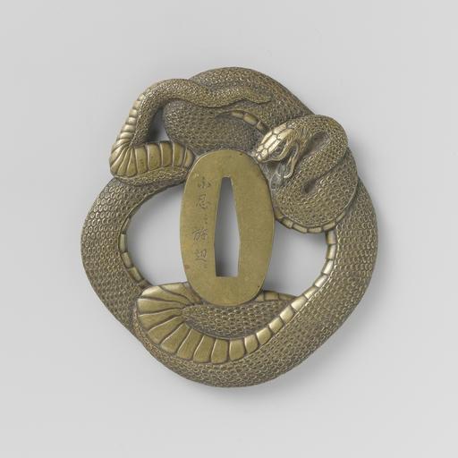 | Keywords: Zwaardstootplaat-Rijksmuseum AK-MAK-1107.jpeg accession number AK-MAK-1107 anonymous; Hidekazu; Terakazu credit line GWToolset Rijksmuseum nl Tsuba in de vorm van een slang met opengesperde bek; tong en oog in roodkooper en zilver; gesigneerd ichiryuken hidekazu of ichiryuken terakazu Label Line possibly Hidekazu 1800 - 1900 messing Height cm 7 8 Width cm 7 2 exhibition history Institution Rijksmuseum brass ; nl roodkoper ; silver object history Acquisition 1972 object type PD-US PD-old Data and photography rights All data and all images made available through the API are either in the public domain or are subject to a CC0 license https //www rijksmuseum nl/en/api/terms-and-conditions-of-use cc-zero place of creation Japan http //www rijksmuseum nl/collectie/AK-MAK-1107 http //hdl handle net/10934/RM0001 COLLECT 1091 handle Zwaardstootplaat Uploaded with GWToolset Rijksmuseum AK-MAK-1107 http //www rijksmuseum nl/media/assets/AK-MAK-1107 Images uploaded by Fæ Art of Japan in the Rijksmuseum Images from the Rijksmuseum |
